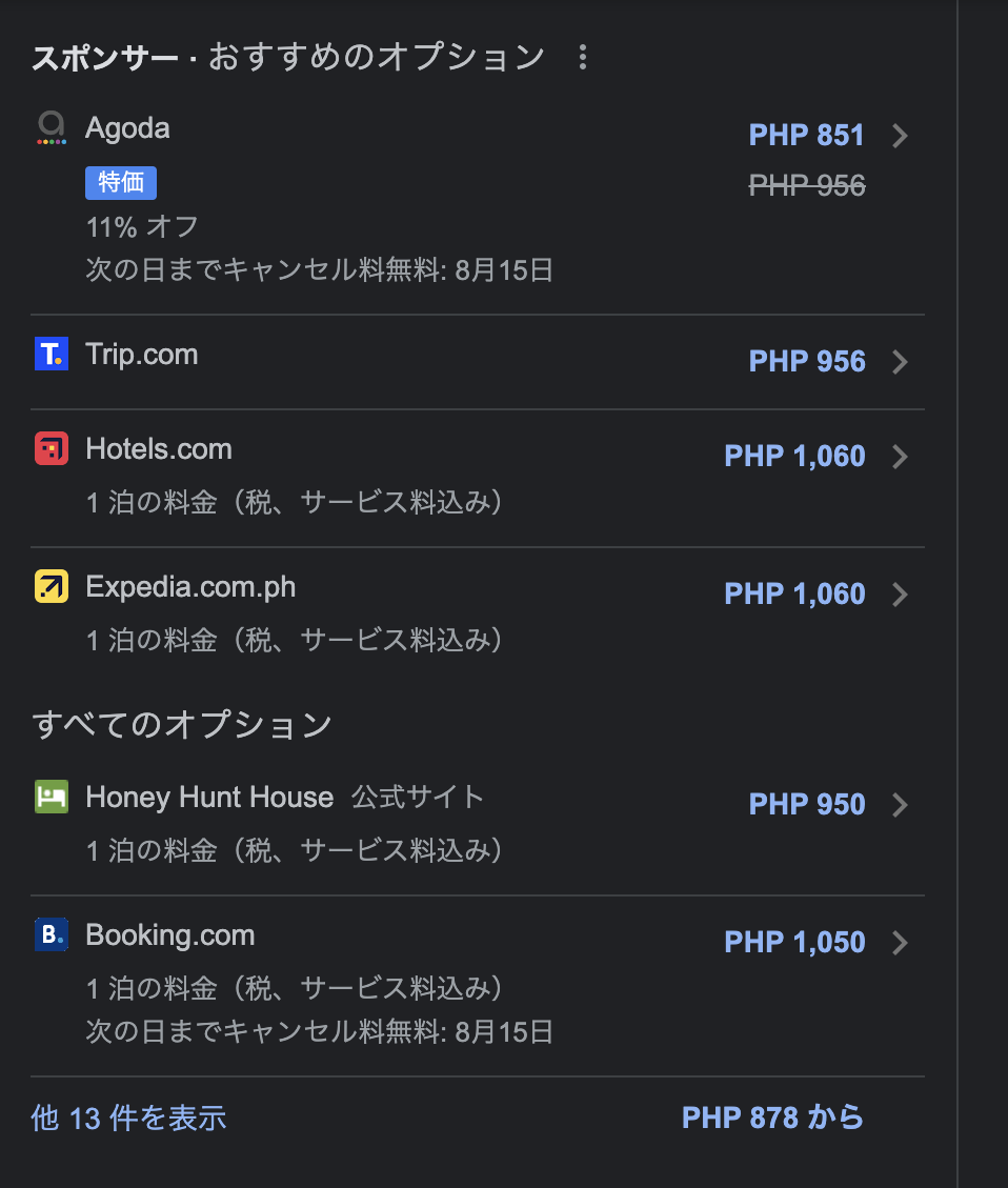 先ほど、Booking.comでWifiの評価やコメントを見る話をしたが、だからと言ってBooking.comで申し込めば良いというものではない。そこで、ホテルを決めたらググって比較してみよう。もっと安いホテルがあるかもしれない。